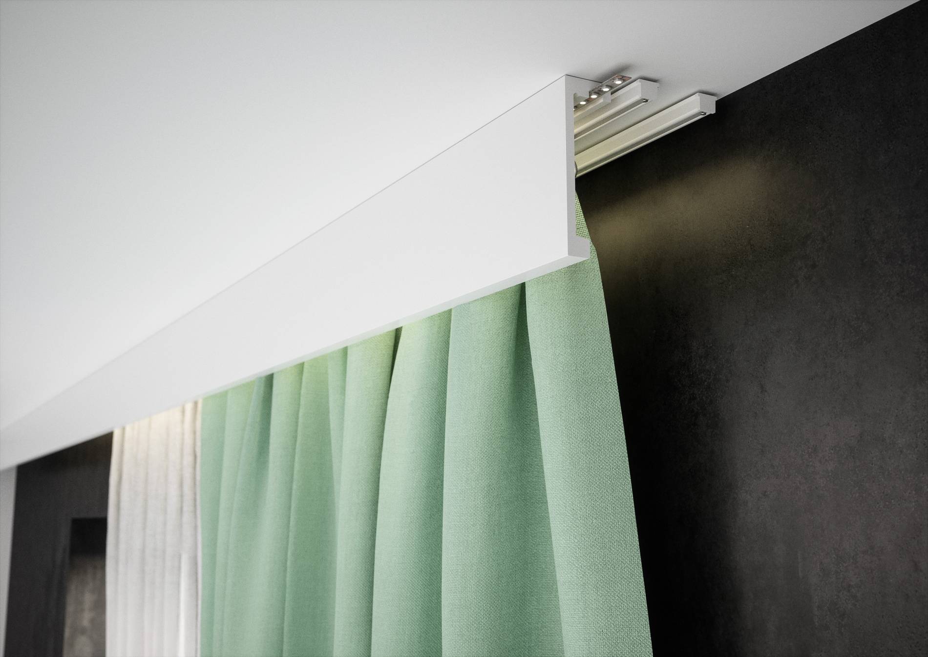 Prosta, minimalistyczna listwa dedykowana do maskowania szyny karniszowej. Wykonana jest z trwałego, odpornego na wilgoć materiału i fabrycznie przygotowana do malowania. Listwa posiada dodatkowo miejsce na montaż paska oświetlenia LED, co pozwala stworzyć niepowtarzalny klimat w każdym wnętrzu.