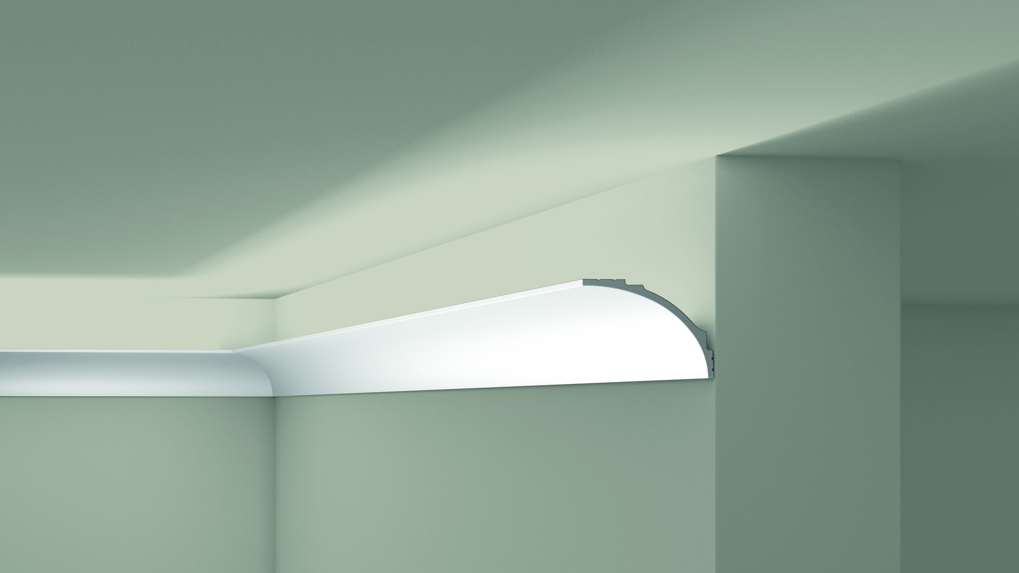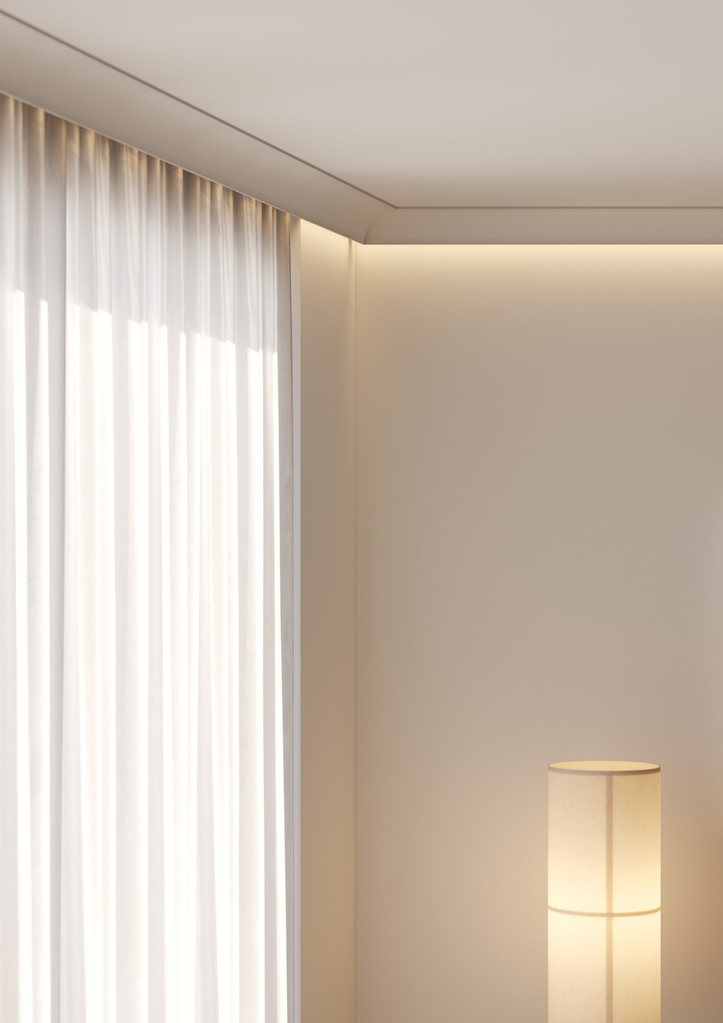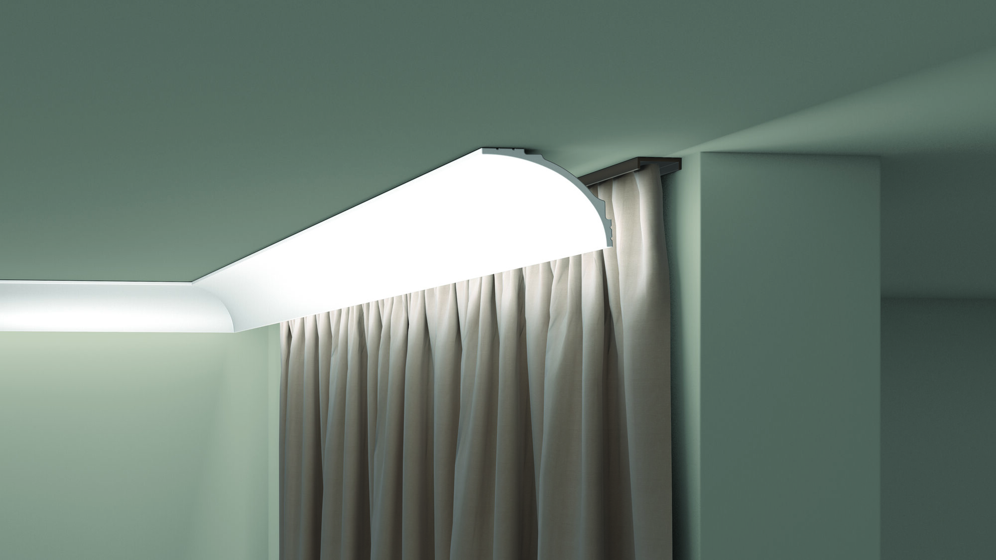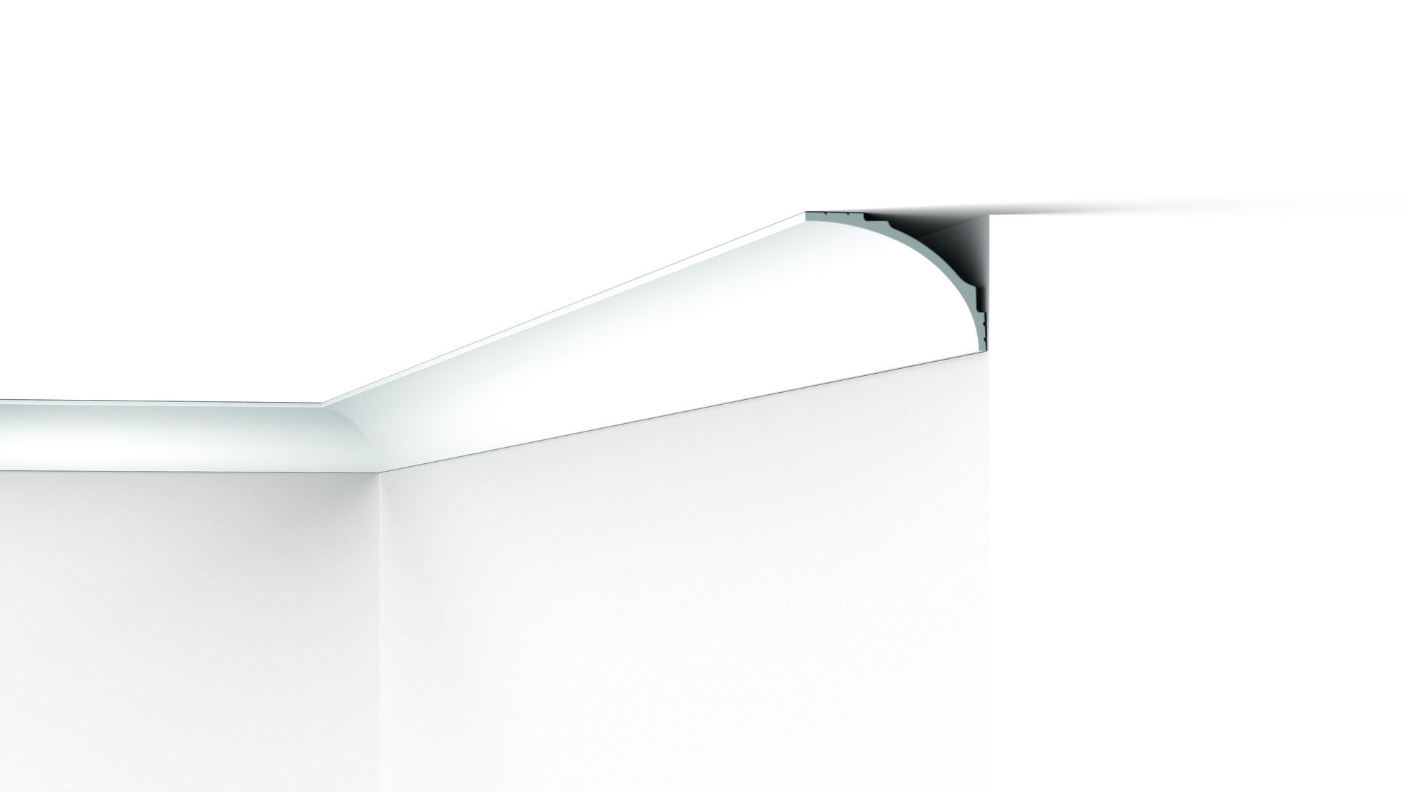 Dekoracyjna listwa przysufitowa przeznaczona do zastosowania jako element montażu lub ukierunkowania oświetlenia LED. Tył listwy posiada powłokę zabezpieczającą przed przenikaniem światła. Model ten sprawdzi się również jako maskownica szyny karniszowej.