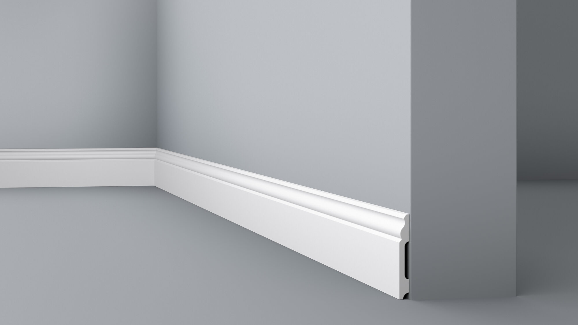 Wysokiej jakości dekoracyjna listwa przypodłogowa pozwalająca w szybki sposób efektownie wykończyć wnętrze na styku ściany i podłogi maskujac nierówności i ukrywając przewody elektryczne.