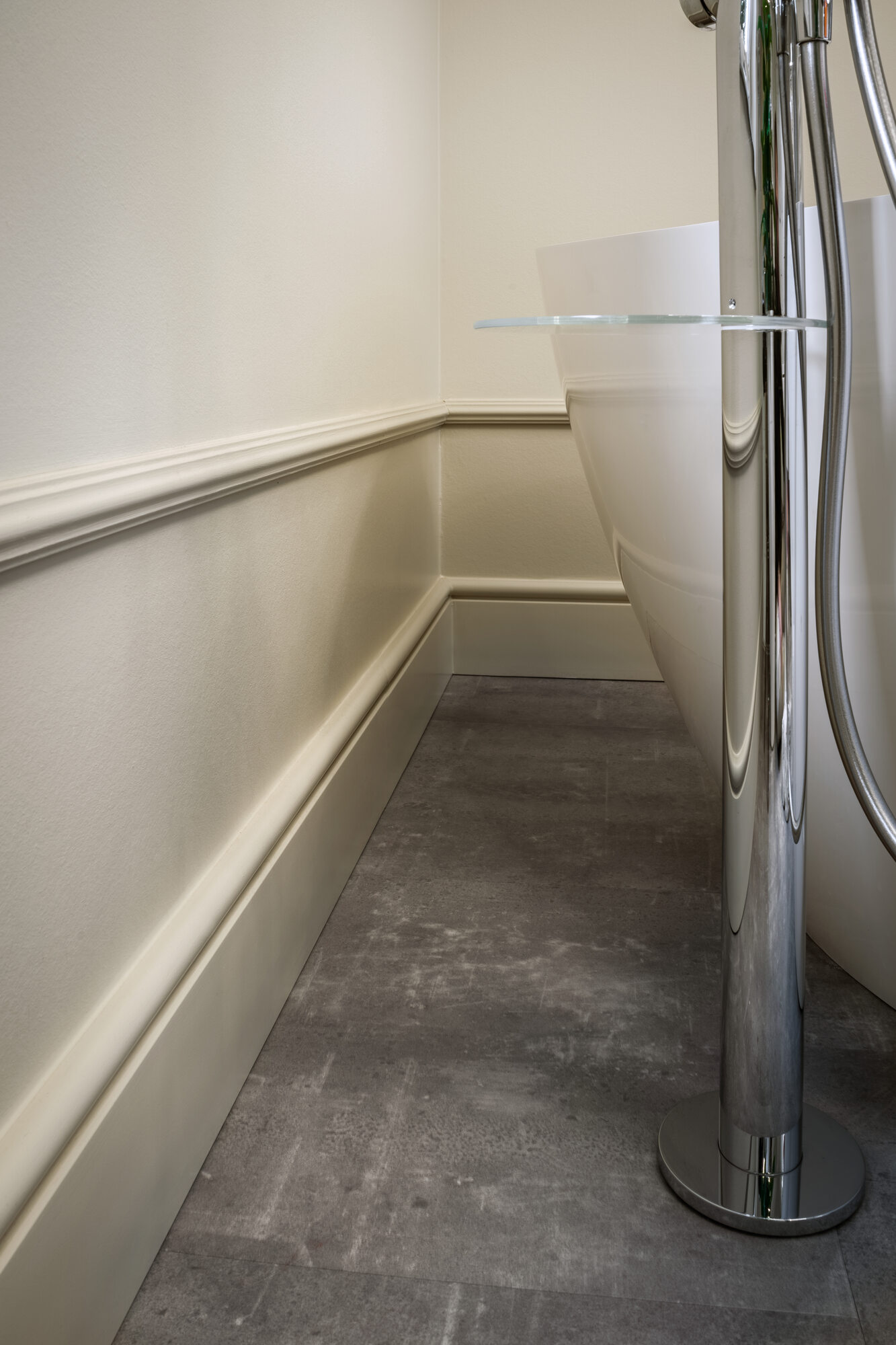 Tutaj, z kolei, zastosowana została listwa przypodłogowa FL14 oraz nad nią w kilkucentymetrowym odstępie, jako przedłużenie, listwa ścienna WL7.
