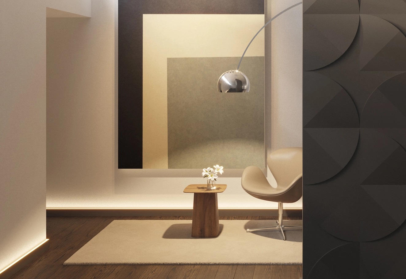 Choć listwy sztukateryjne kojarzą się najbardziej z klasycznymi wnętrzami, warto pamiętać, że dziś, dzięki obfitości wzorów i modeli listew, możemy z sukcesem stosować je w nowoczesnych wnętrzach. Kluczową kwestią będzie tylko dobór odpowiednich listew - najlepiej sprawdzą się te proste w formie, bez zdobień i ornamentów modele. Na stronie esztukaterie.pl znajdziesz wiele takich modeli. Poniżej inspiracja z użyciem minimalistycznej listwy FD15S WALLSTYL.