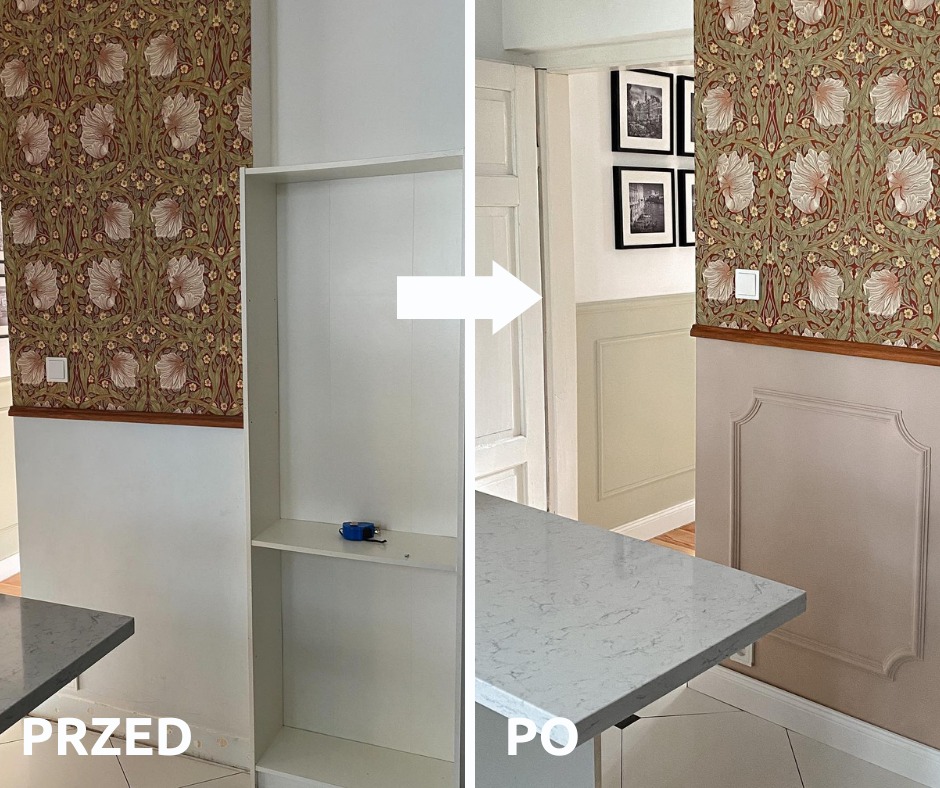 Wykonanie tej metamorfozy zajęło Beacie z "Pani to potrafi" dwa popołudnia. Jedno popołudnie upłynęło pod kątem porządkowania i malowania, a kolejne na docinaniu i przyklejaniu listew sztukateryjnych. Jestem oczarowaną tą zmianą, ponieważ udowadnia jak w bardzo prosty sposób - dobierając odpowiednie listwy i kolory, można całkowicie odmienić charakter wnętrza. W tym przypadku zostały zastosowane listwy przypodłogowe, jedna listwa ścienna dzieląca ścianę na pół, oraz panele ścienne zamontowane na dolnej części ściany. Wykonanie takiej lamperii z paneli ściennych to świetny sposób na ochronę ściany w miejscach, w których narażona jest na obicia czy odkształcenia.