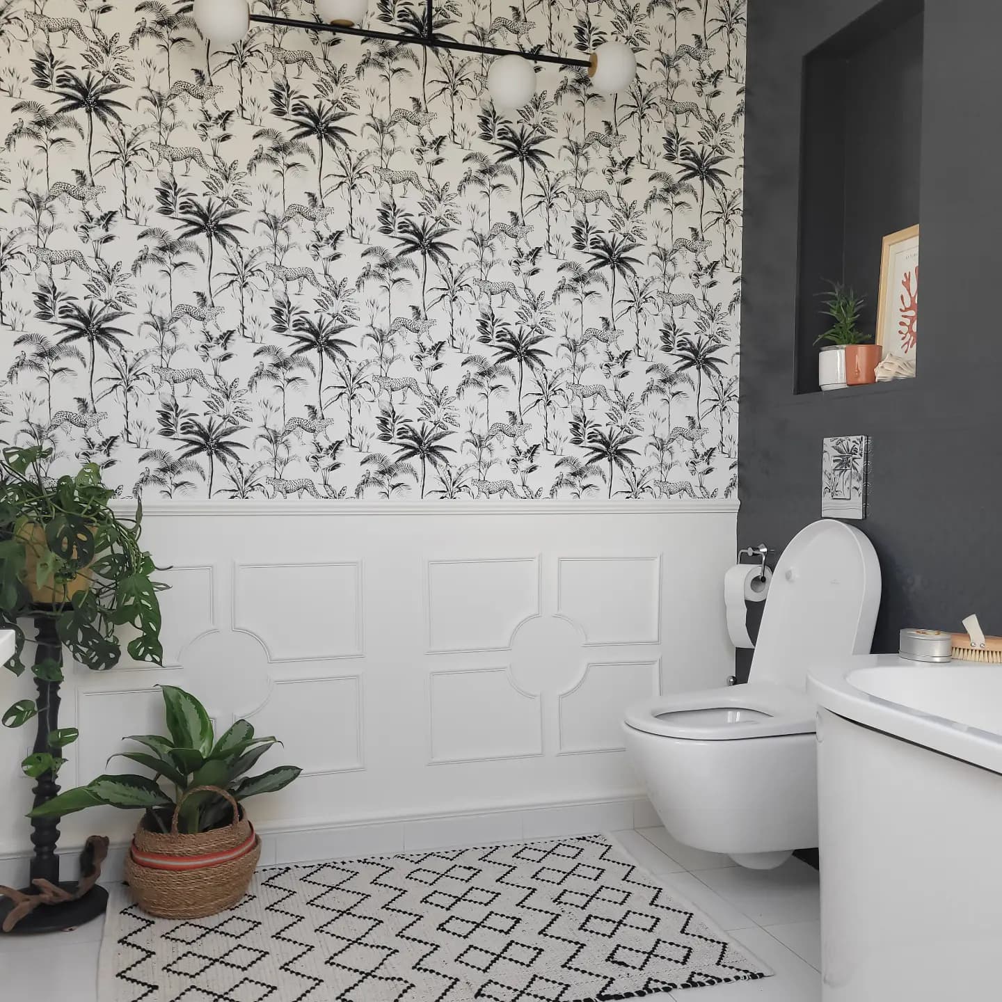 Doskonały pomysł na dodanie przytulności zimnej łazience: na dolnej części ściany lamperia wykonana z listew sztukateryjnych, a and nią tapeta. Akcenty ze sztukaterii wniosły do tego zimnego wnętrza element salonowy. Małgosia chcąc przełamać typowy układ listew w tzw. ramkę, sięgnęła po narożniki, które dla oryginalnego efektu ułożyła w koło. Lamperia to świty pomysł na dekorację ściany także w sypialni, przedpokoju czy kuchni. Do jej wykonania możesz użyć różnego rodzaju listew oraz pomalować je na wybrany kolor.