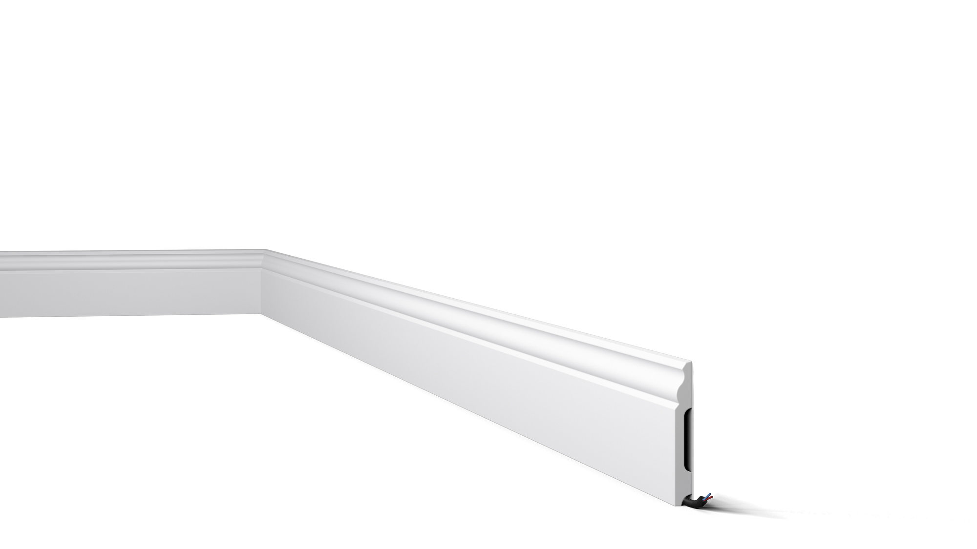Wysokiej jakości dekoracyjna listwa przypodłogowa pozwalająca w szybki sposób efektownie wykończyć wnętrze na styku ściany i podłogi maskujac nierówności i ukrywając przewody elektryczne.