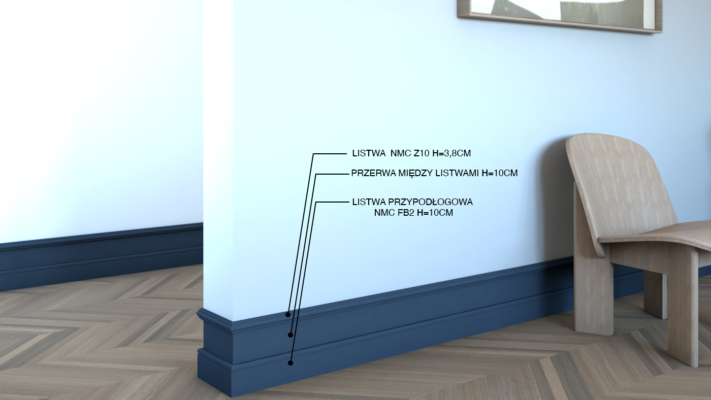 Aby uzyskać optycznie większą wysokość listwy, można użyć różnych listew, łącząc je ze sobą w taki sposób, aby uzyskać efekt warstwowy. To połączenie doda głębi i interesującego detalu. Poniżej propozycja połączenia listwy przypodłogowej FB2 o wysokości 10 cm oraz listwy ściennej Z10 o wysokości 3,8 cm. Dzięki zamontowaniu listew w odległości 10 cm od siebie oraz pomalowania całości na jeden, wyróżniający się na tle ściany kolor, uzyskany został efekt wysokiej prawie 24 cm listwy.