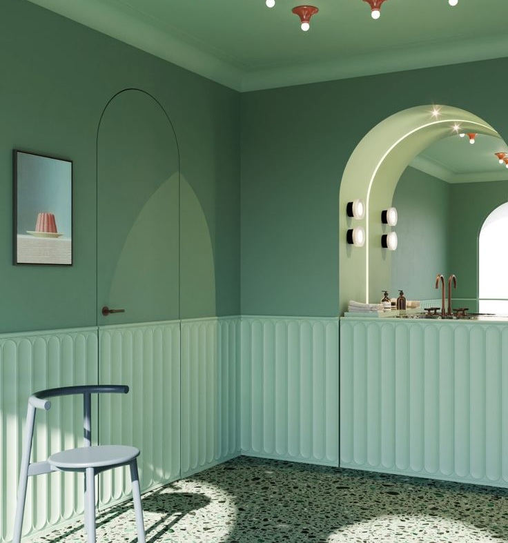 Poniżej pomysł na wydzielenie strefy umywalek w dużym pokoju kąpielowym za pomocą paneli 3D Canele S.