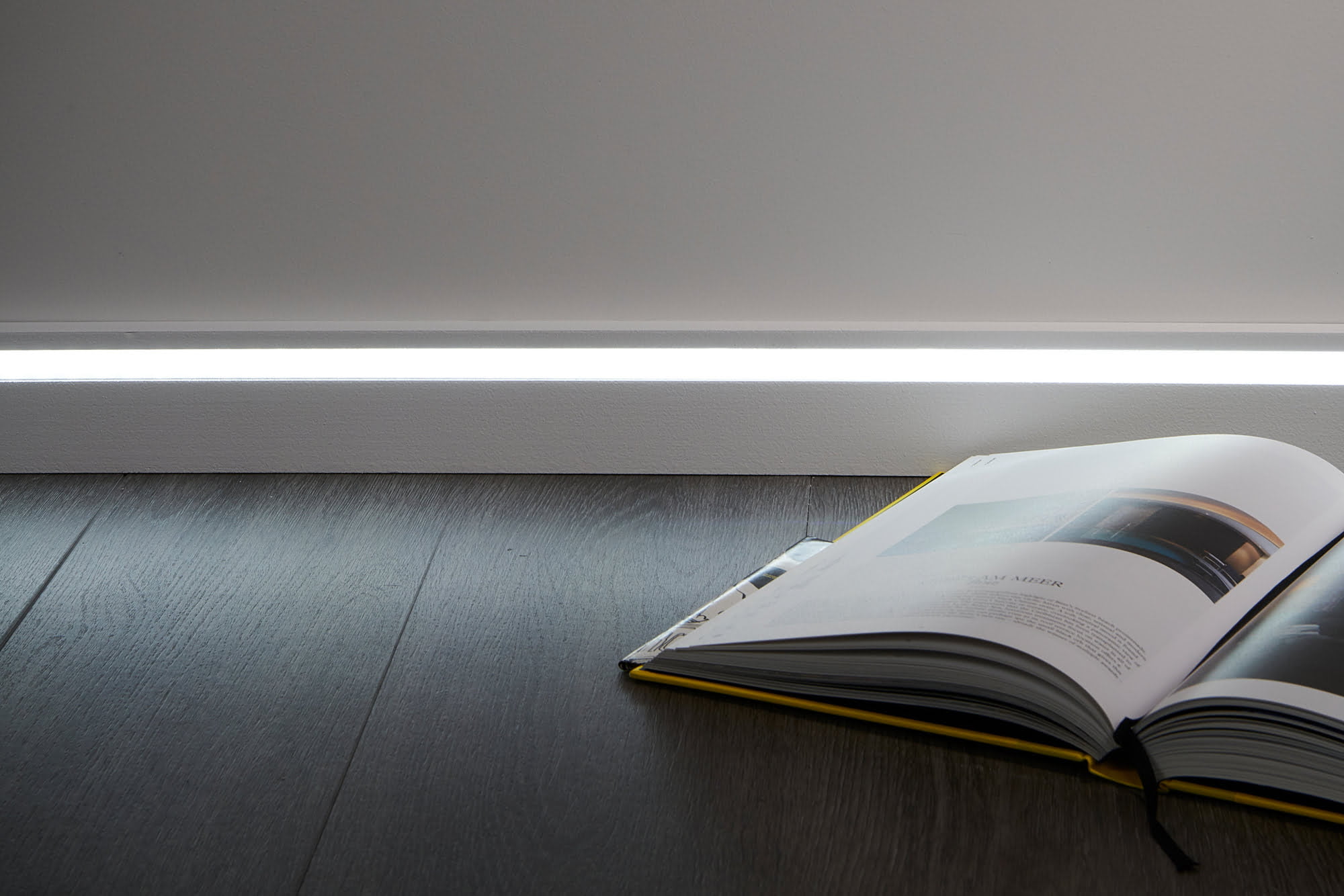 Z kolei, do stworzenia minimalistycznej, ale efektownej, dekoracji wnętrza odpowiednie będą listwy przyścienne (z podświetleniem lub bez). Można poprowadzić je na wiele ciekawych sposobów. Poniżej użyty model: IL12.